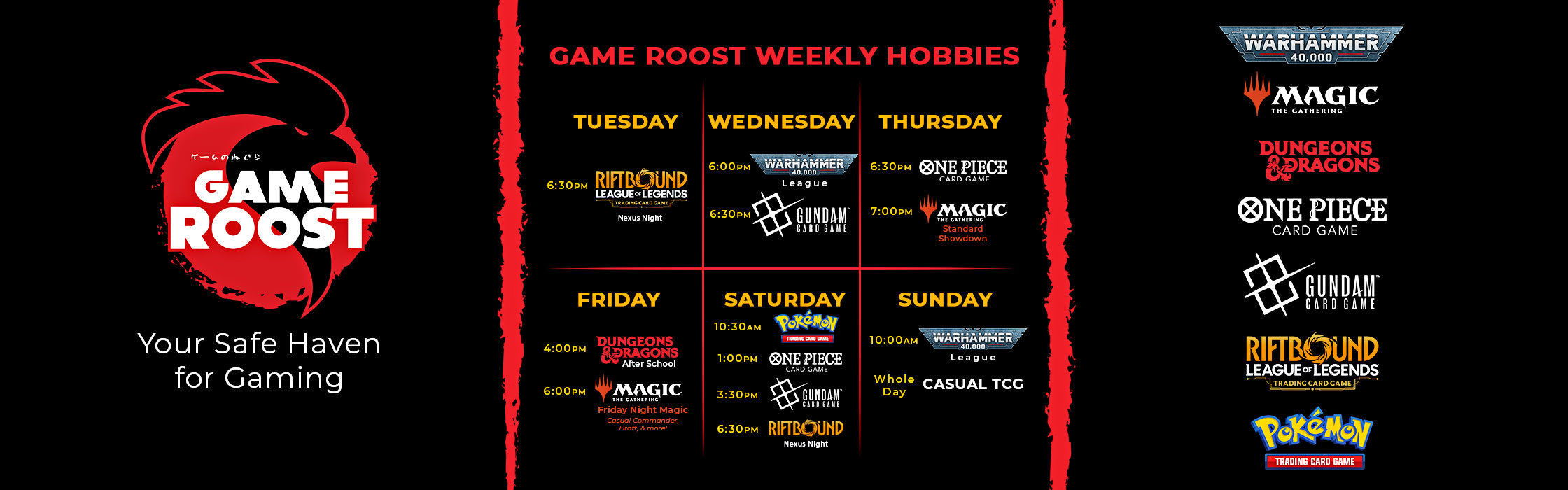 Whether you’re looking for a Warhammer store, Pokémon TCG store, or you're getting into Magic: The Gathering, One Piece Card Game, Gundam TCG, or Riftbound, Game Roost has everything you need. Plus, we have the welcoming space and unique experience that make every visit more than just a game.
